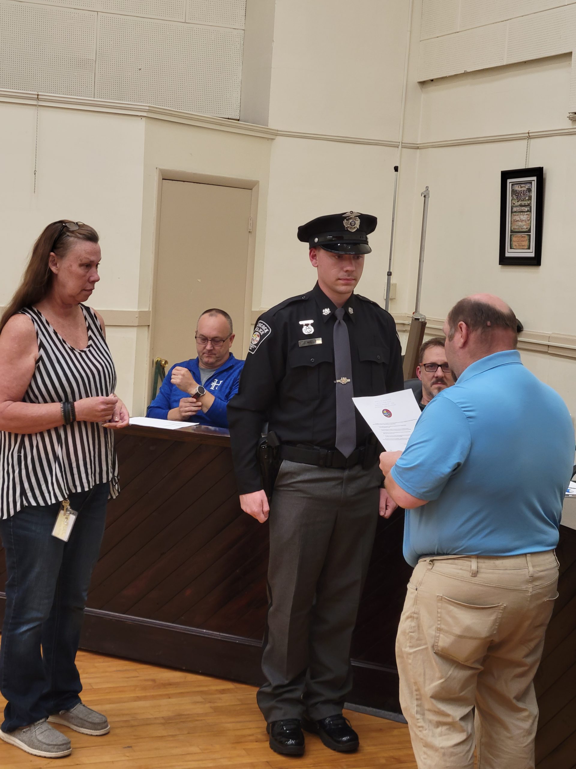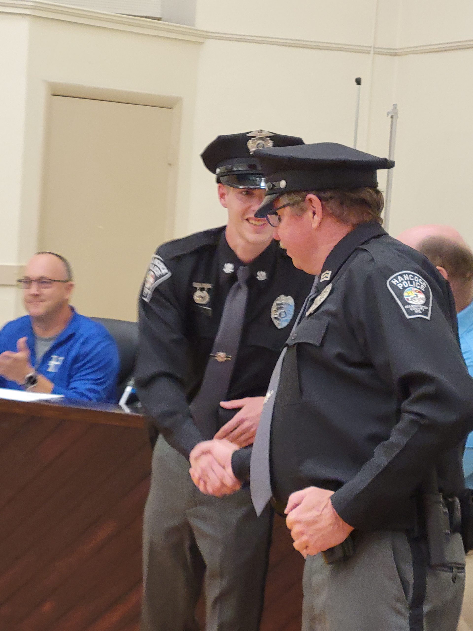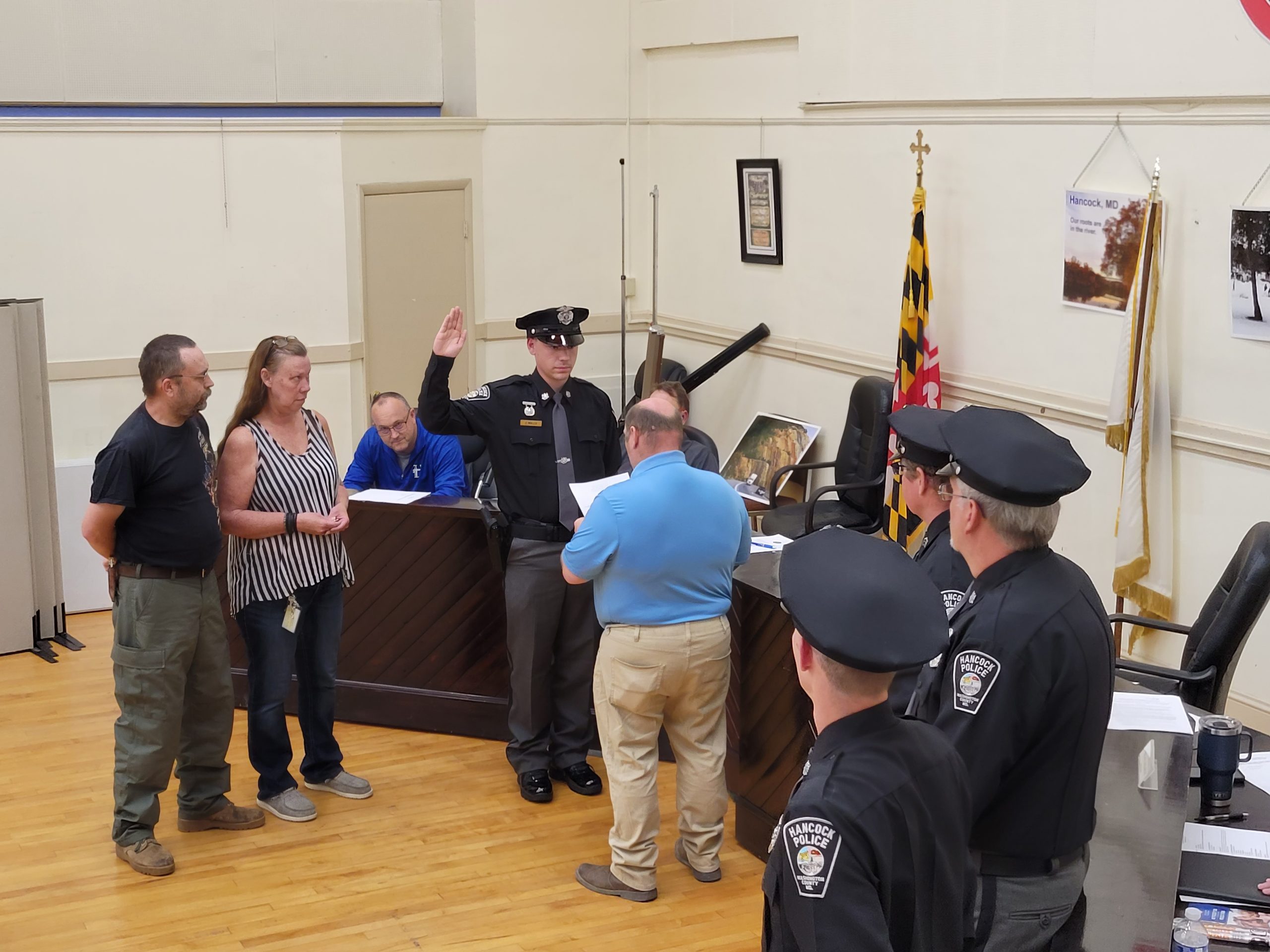 There are two new officers officially patrolling the streets of Hancock.  Mayor Tim Smith swore in the new officers during the June town meeting June 7.