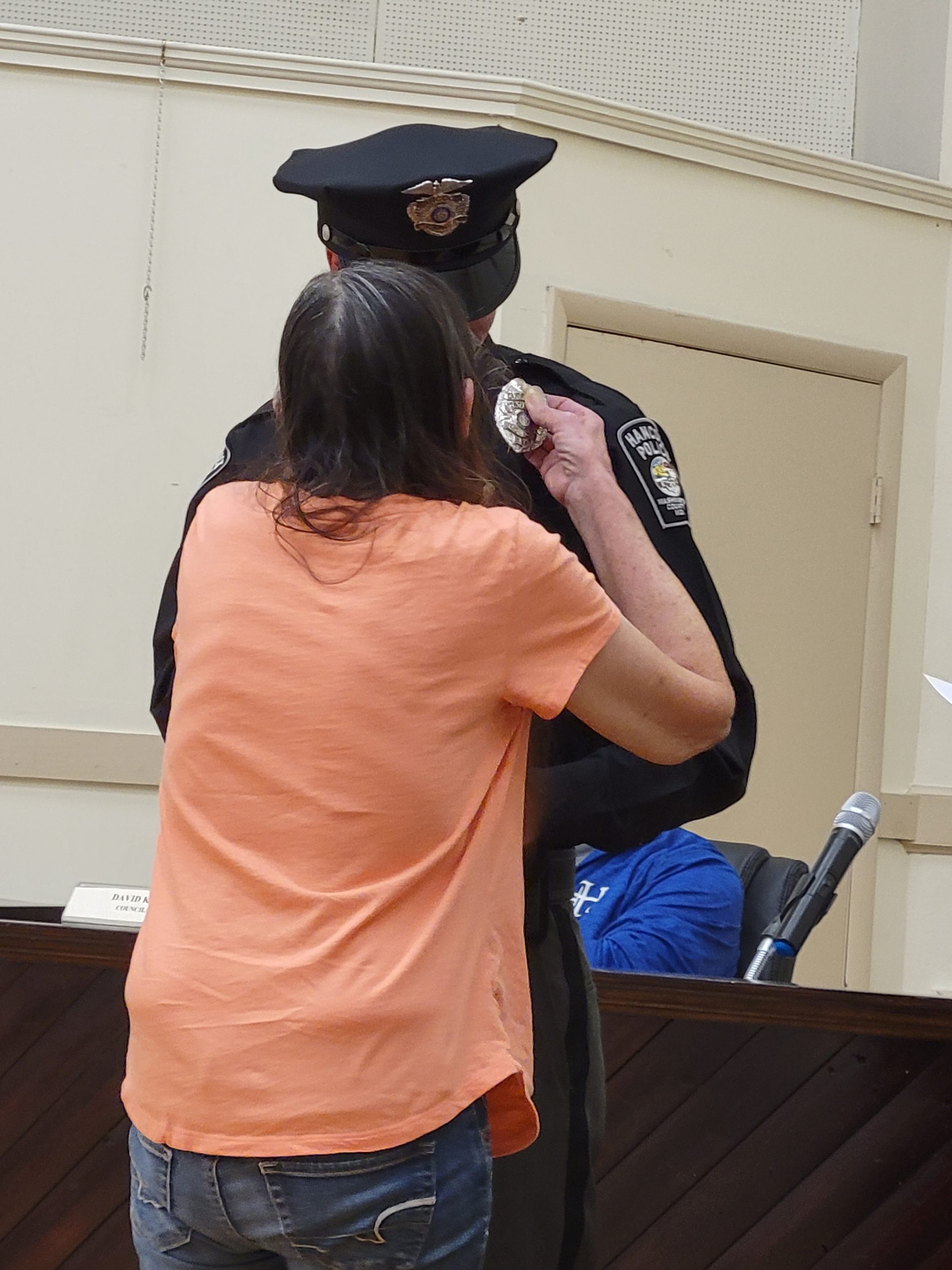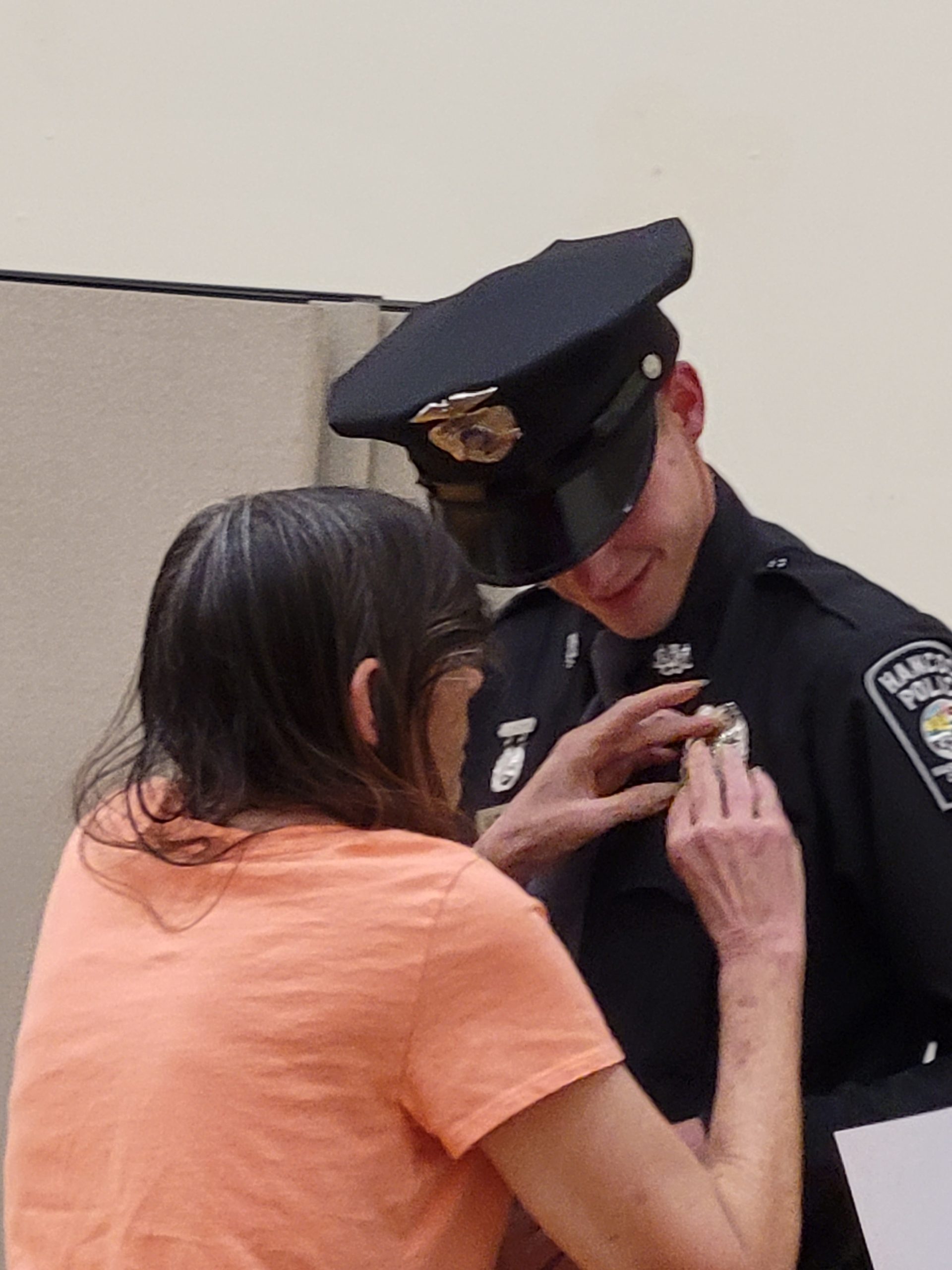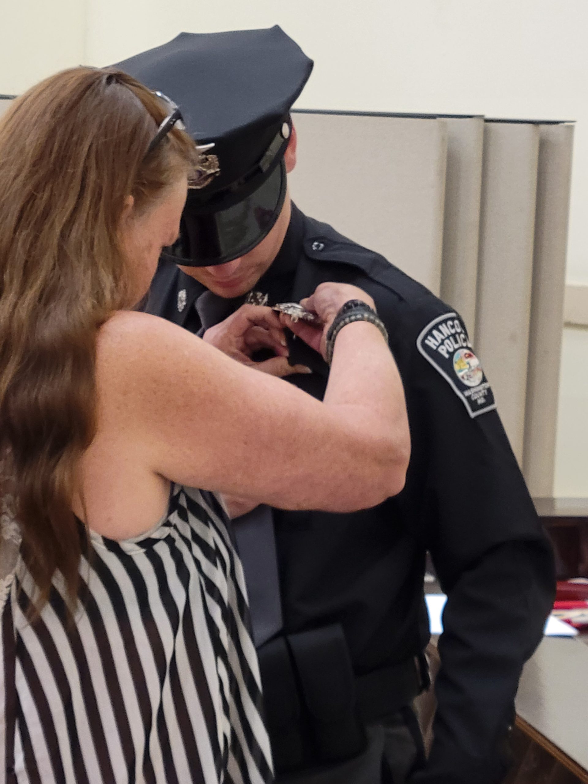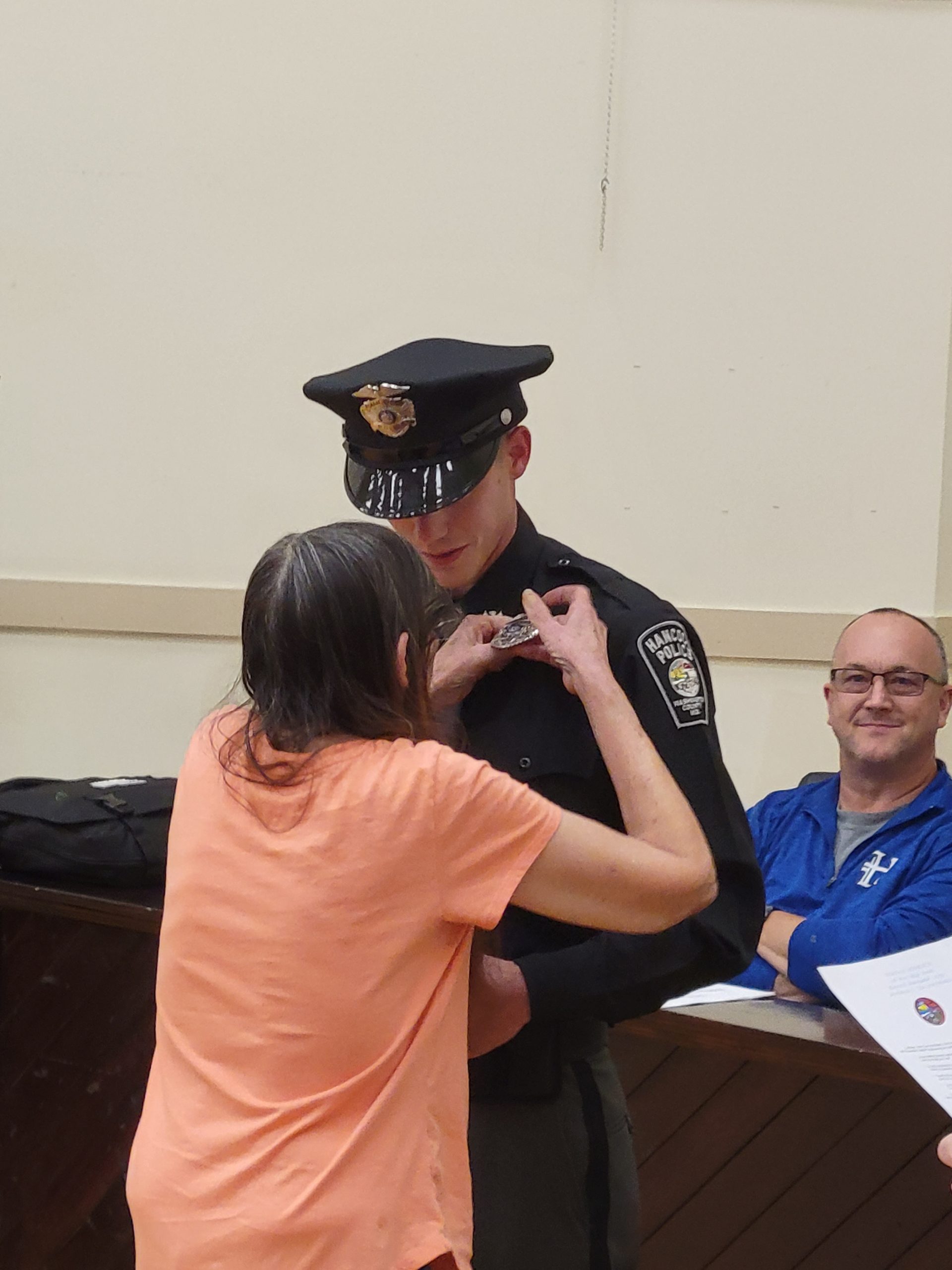 After he was sworn in, Nancy O’Brien pinned her son’s badge on his uniform. Kelly Walls also did the same for her son.