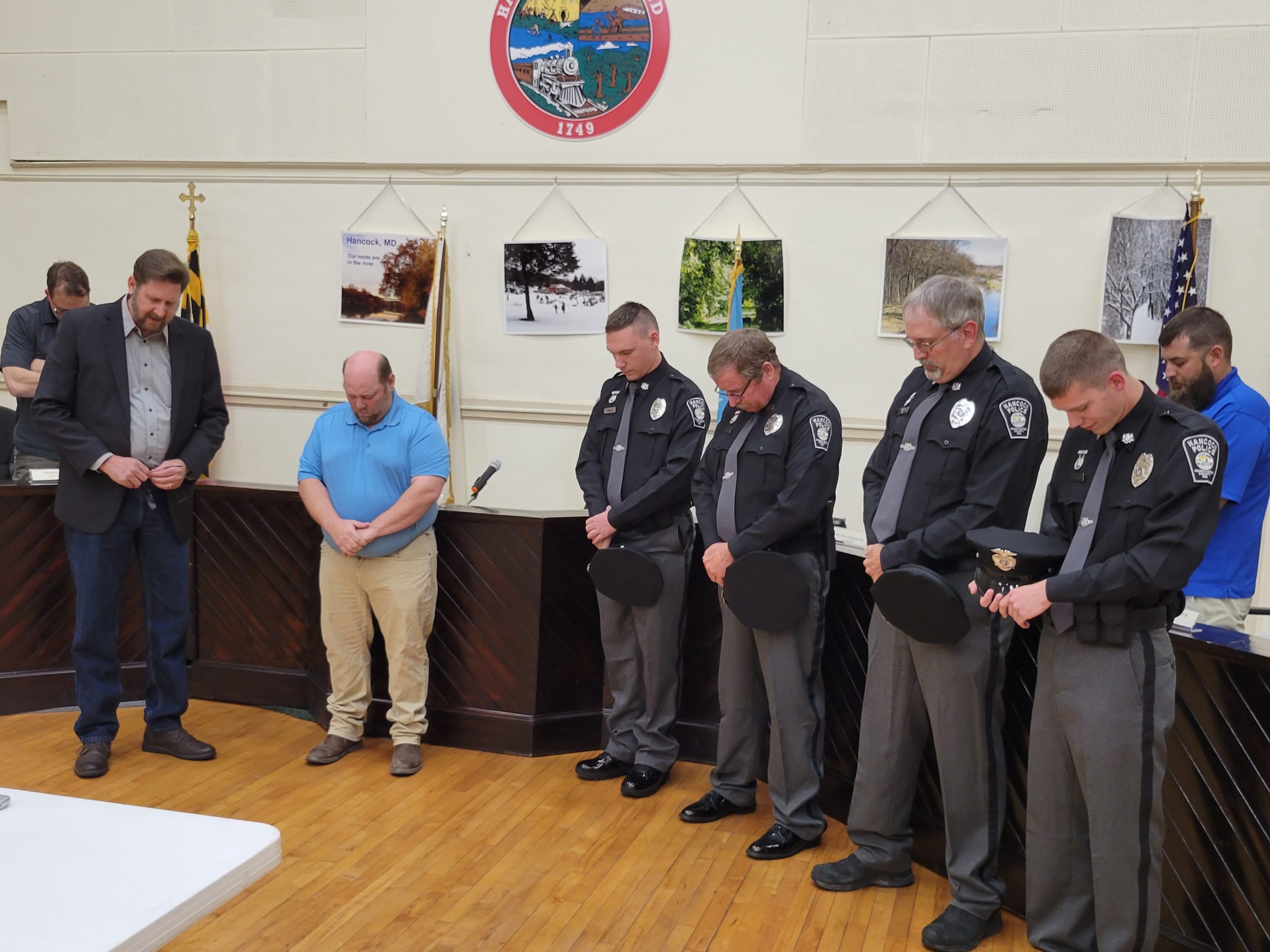 Rev. James Touchton of the Hancock Church of God and Chaplin for the Hancock Police Department gave a blessing over the two officers to end the swearing in.