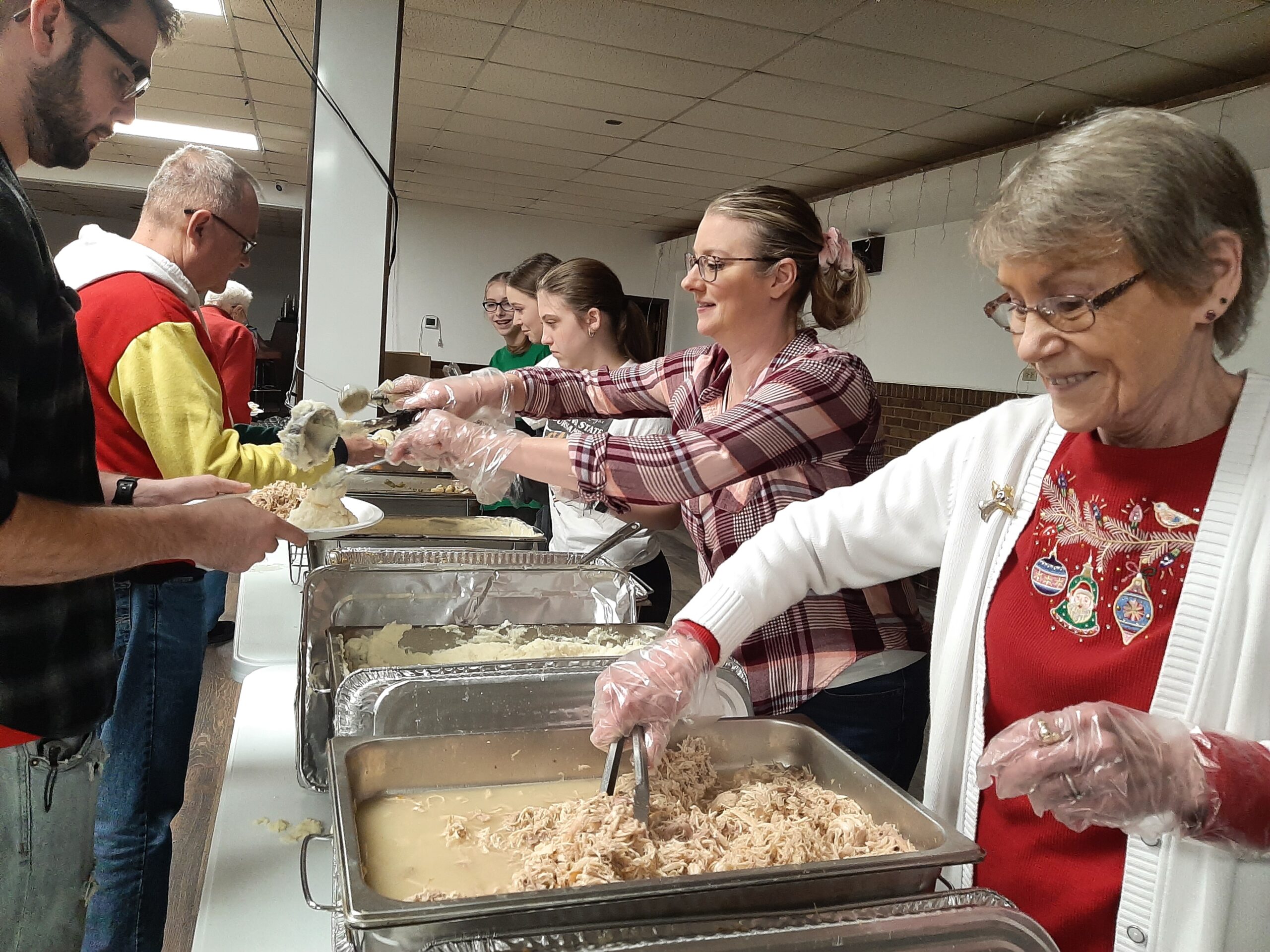Cheerfully greeting each diner, they ladled plates with roast turkey, stuffing, mashed potatoes, gravy, and green beans. Hot rolls with butter, homemade pies and cakes completed the delicious holiday meal.