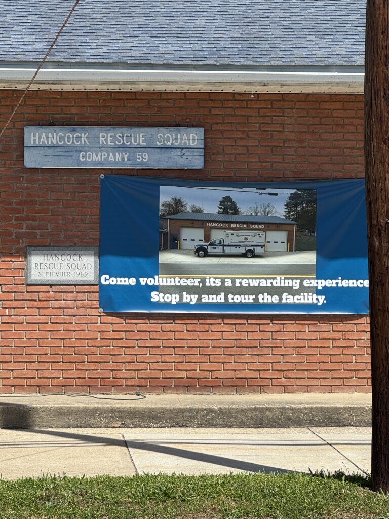 A banner hangs on the outside wall of the Hancock Rescue Squad building seeking volunteers.